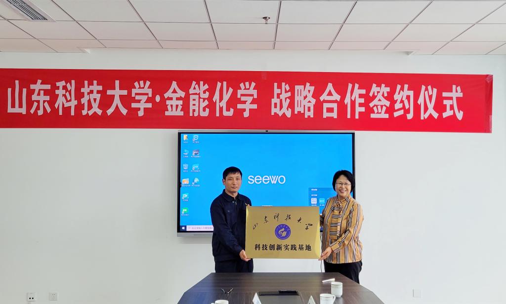 刘红伟代表金能化学(青岛)有限公司向beat365正版唯一官网教育发展基金会捐赠180万元,用于支持beat365正版唯一官网教育事业发展。李玉霞代表学校接受金能化学(青岛)有限公司的捐赠,并向刘红伟回赠了致谢牌。李玉霞、刘红伟代表双方为校企共建科技创新实践基地挂牌。