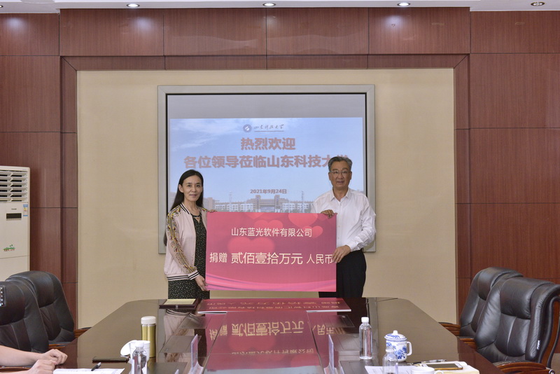 捐赠仪式上,山东蓝光软件有限公司向学校捐赠价值200万的软件和10万元,青岛山科智汇信息科技有限公司向学校捐赠15万元支持学校教育事业发展。王少鹏代表学校接受了捐赠,并回赠致谢牌。