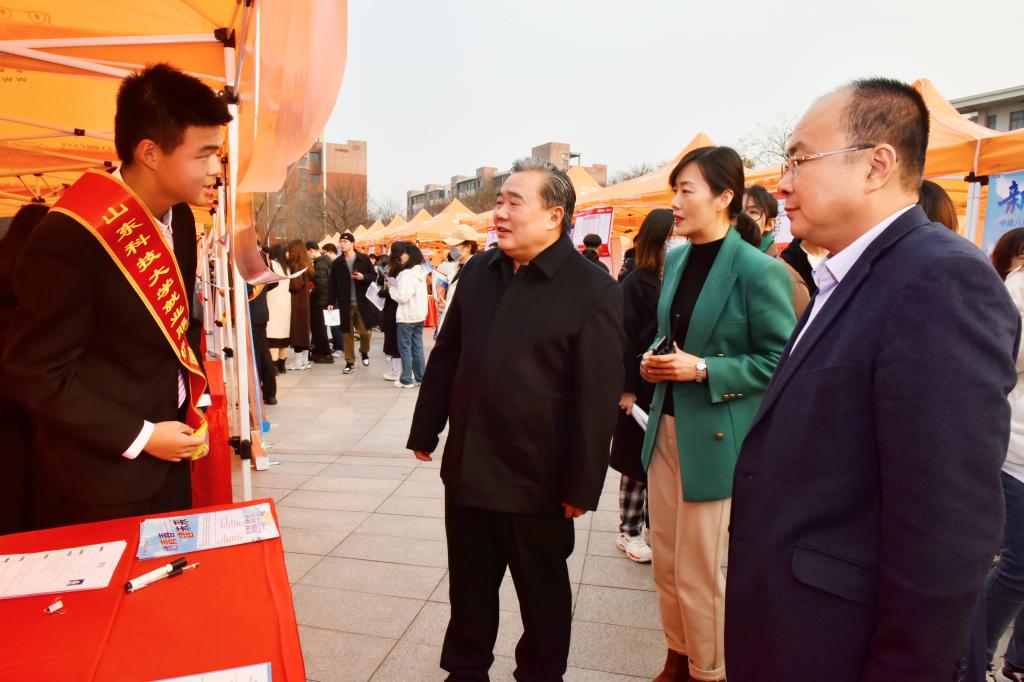 “八方来校招贤纳士,四海资源齐聚一堂”,在疫情防控常态化的今天,这般人山人海、现场交流的线下招聘会已非寻常。11月16日,在beat365正版唯一官网青岛校区举办的“就选山东”山东省2021年高校毕业生集中招聘活动暨beat365正版唯一官网“大使代言,助你就业”秋冬校园双选会上,应届毕业生却在感兴趣的企业展位前排起了长队,与招聘单位面对面谈得起劲。仔细一看,进行企业宣介并代收求职简历的不是招聘单位,而是受企业委托的“校园大使”;滚动播放的企业宣传视频中不乏科大年轻校友的身影;现场宣讲就业相关政策、为毕业生解疑释难的是电子大屏,实时连线的是相关地市人社局;直播间里,山东港口集团等六家知名企业开展远程“职”播带岗,与毕业生直接沟通,推介企业岗位……“大使代言,助你就业”招聘大集就这样火热开市。校长姚庆国,校党委常委、宣传部部长李克周及相关职能部门负责人到招聘会现场调研就业情况,亲自体验扫码、观看直播等活动,与提前来求职的毕业生们亲切交流。