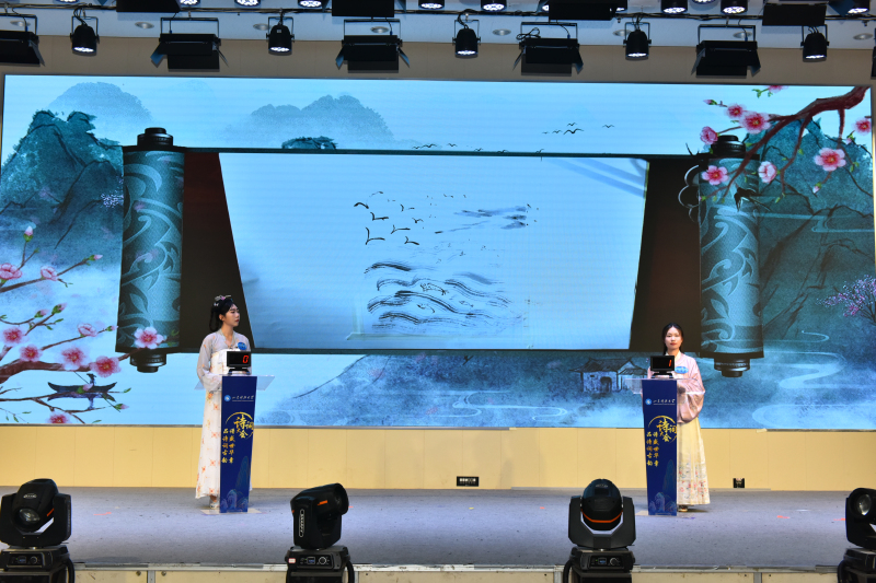 在比赛环节间隙,诗朗诵、歌曲等节目穿插上演。学校留学生的诗词朗诵《行路难》《再别康桥》字正腔圆,文法大艺团声乐队的歌曲《岳阳楼记》悠扬绵长,文法学子将《沁园春·雪》《小平,您好》《满江红·江上青百年诞辰祭》《科学发展观之歌》《念奴娇·追思焦裕禄》等诗作朗诵出爱国真情,让诗词大会成为学生品味党史、感悟传承、夯实文化底蕴的思想政治教育实践课新载体,以此献礼党的二十大。