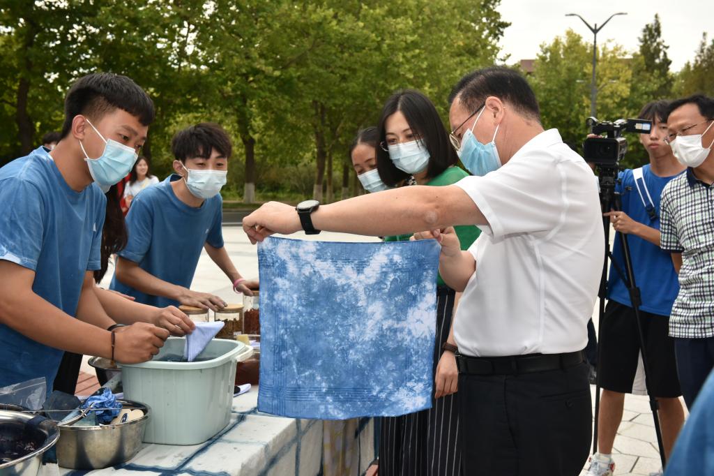 “能参与本次蓝染体验活动真是太好了,‘以学生为师’是一种不同于平时相处的独特体验。能在课堂之外、教学之余与同学们一起动手制作蓝染方巾,是我在今年教师节收到的最美好最独特的礼物。”“最美教师”刘春晖如是说。