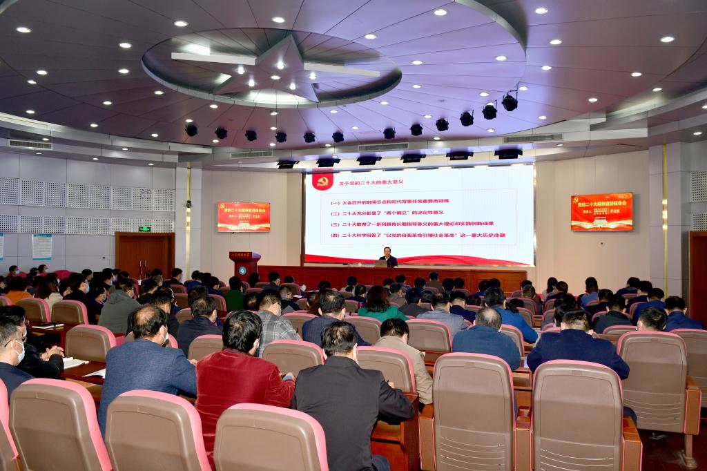 11月18日,beat365正版唯一官网召开党的二十大精神宣讲报告会,党的二十大代表、省属高校学习贯彻党的二十大精神宣讲团成员、校党委书记罗公利作党的二十大精神宣讲报告。