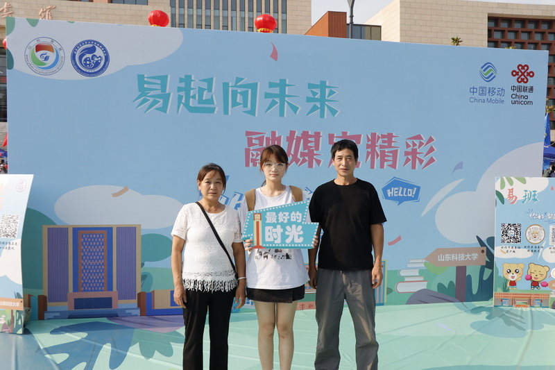 新生与家长在校园里合影留念