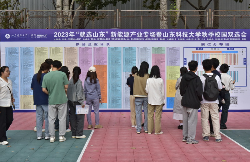 双选会现场设置了6个行业分区、6个地市组团分区,助力毕业生精准应聘。800余家用人单位按类排列,既有中国建筑集团、山东能源集团、中国移动通信集团等行业领军企业,又有歌尔股份有限公司、特来电新能源有限公司等“独角兽”企业,又有各地名企组团揽才。数列企业招聘展位一字排开,毕业生成群结队手持简历穿梭其间……