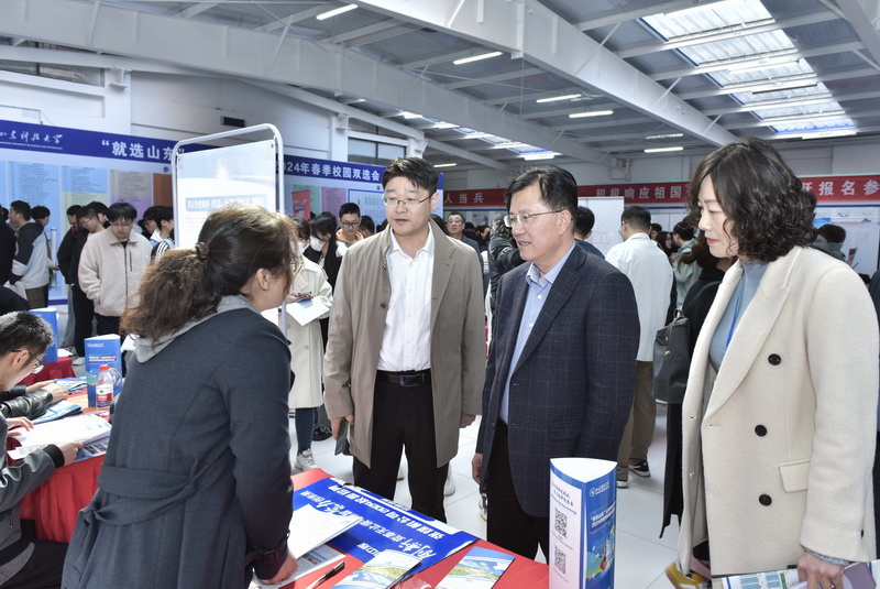 “今年招聘计划是多少?”“这名同学专业知识扎实,创新能力很强……”各学院党委书记、院长、教师、辅导员、班主任等纷纷走进双选会场,了解行业企业招聘计划和岗位设置情况,并当起毕业生“推介员”,向用人单位推介毕业生。泰安校区、济南校区有关负责人、院系负责人携带校区毕业生简历,来到双选会现场,为校区毕业生投递简历,推介校区毕业生。