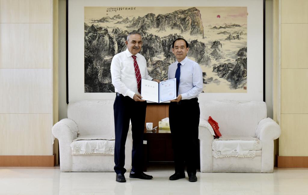 6月14日,加拿大麦吉尔大学Hani S.Mitri教授来校交流。校长曾庆田会见客人,并为他颁发《Journal of Industrial Safety》主编聘书。