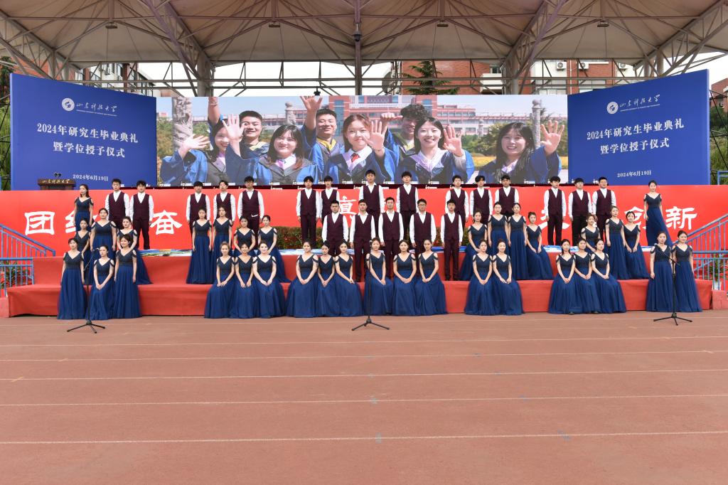 典礼开始前,10余名毕业研究生带来了歌曲快闪节目,用动情的歌声诉说着对母校的浓浓眷恋;举行了学校毕业微电影《不负别时》的首映式,特别献给2024届全体毕业研究生;艺术学院教师孟晓和天齐合唱团以合唱形式为毕业生送上祝福;全体毕业研究生通过无人机拍了一张“大合影”。典礼结束后,校领导为全体研究生举行了学位授予仪式。