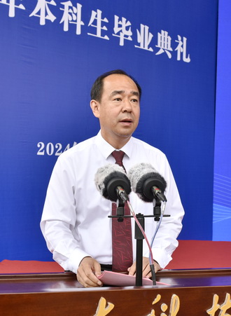 曾庆田代表学校向圆满完成学业的2024届全体本科毕业生表示热烈的祝贺和深情的祝福,向为此付出辛劳的老师、家长致以崇高的敬意和衷心的感谢。他深情回顾了同学们从入山科到驻山科再到出山科、念山科的成长历程,分享了优秀毕业生不平凡的青春追梦故事,他表示,四年的求学时光记载了同学们朝气蓬勃的青春风采,也承载了大家绚丽多彩的青春梦想,学校见证了同学们从青涩懵懂到坚定自信,看到了大家在青春赛道上奋力奔跑的模样,这些经历都将成为同学们人生路上宝贵的积淀。同学们即将重新起航,踏上新征程,希望同学们不负青春、不懈努力,在实践中淬炼,在拼搏中磨砺,努力成为“行稳致远”的奋进者、开拓者、奉献者。