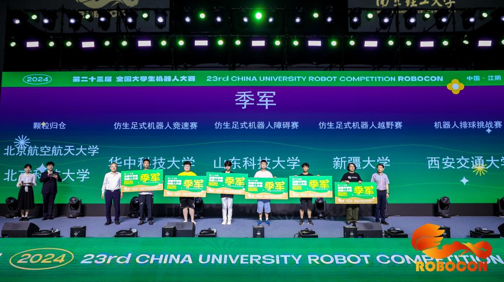 由机电学院学生吴思远、王锦程、马豪阳等组建的“小平科技创新团队.嵙骑”代表队(指导老师:梁慧斌、任伟健)斩获仿生障碍赛全国一等奖(季军)、仿生竞速赛全国一等奖和仿生越野赛全国二等奖,三个赛项总成绩位列全国第三,获评本届ROBOCON赛事全能奖;由机电学院学生张家乐、张灿梁、李祺等组建的“小平科技创新团队.嵙骏”代表队(指导老师:梁慧斌、宋阔)获得仿生障碍赛和仿生越野赛全国一等奖、仿生竞速赛全国二等奖;由自动化学院学生杨洋、张宇、张淋皓等组建的“beat365正版唯一官网OVERTURN战队”代表队(指导老师:崔保春、蒋忠贇)获得ROBOCON主赛项颗粒归仓全国三等奖、颗粒归仓操作赛项全国二等奖、机器人排球赛项全国二等奖、仿生足式障碍赛全国二等奖、仿生足式竞速赛全国三等奖。