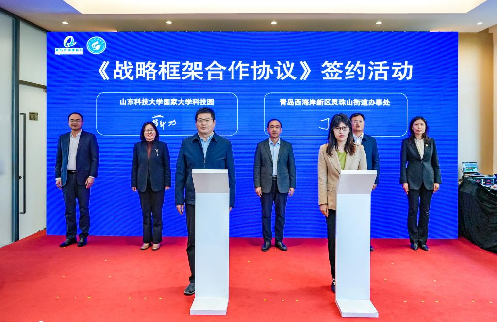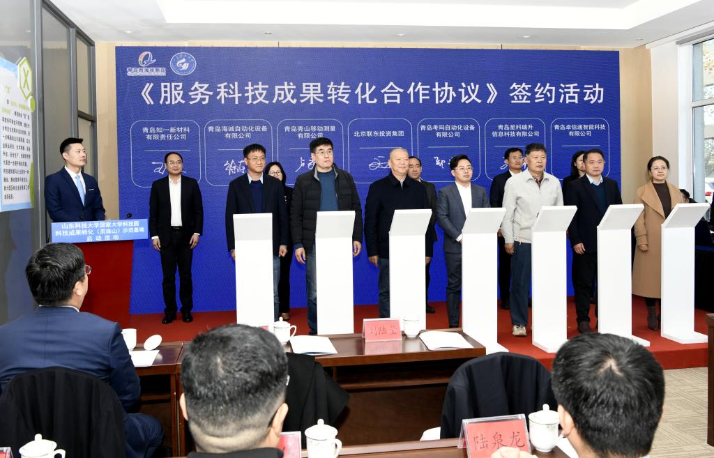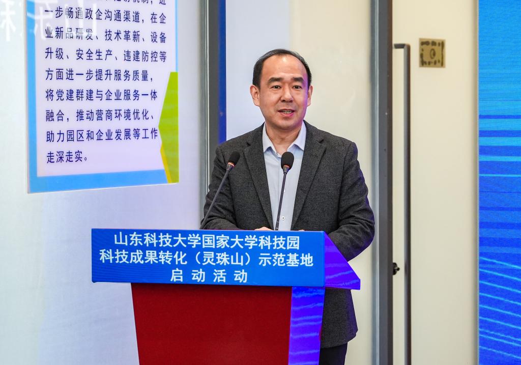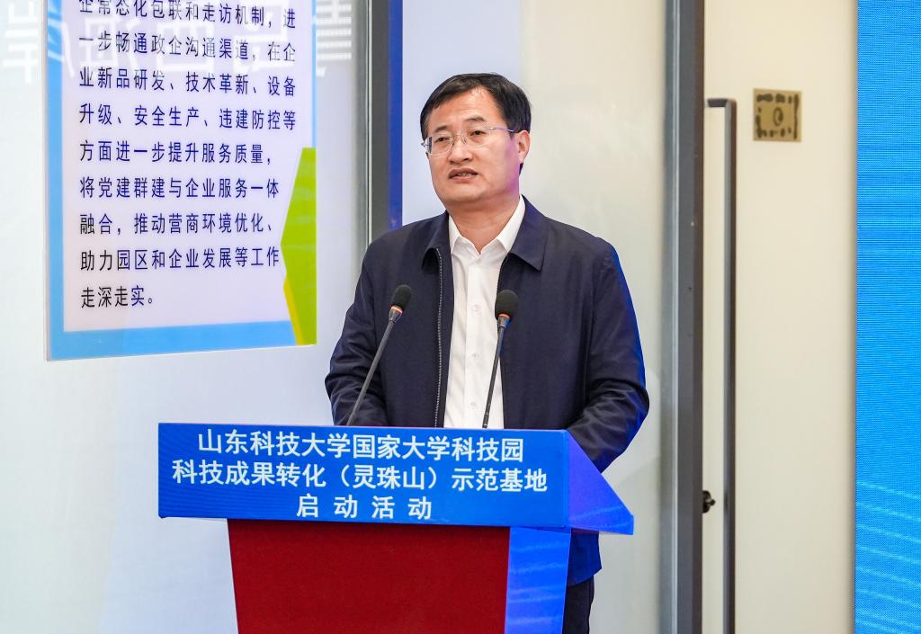 曾庆田在致辞中表示,beat365正版唯一官网国家大学科技园现有高等学校科技成果转化和技术转移基地、国家技术转移示范机构等八个国家级服务平台,始终坚持在科技成果转化、科技企业孵化、创新创业人才培养上持续发力,学校国家大学科技园成果转化(灵珠山)示范基地的建设启动,是实现科技成果转化落地的创新举措。我们欣喜地看到已有青岛星科瑞升信息科技有限公司、青岛秀山移动测量有限公司、青岛知一新材料有限责任公司等6家企业转入灵珠山示范基地进行产业化发展,希望示范基地融合校地资源,把基地建设成为校城深度融合发展的“新高地”,为新区经济社会发展做出新贡献。