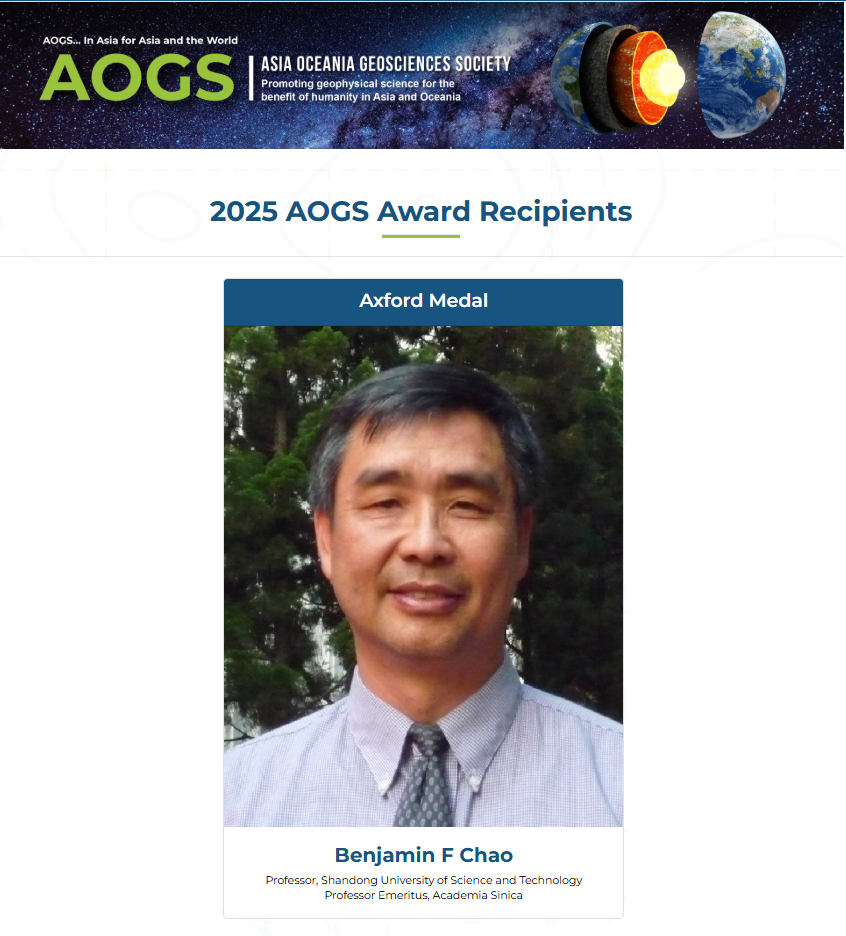 近日,亚洲-大洋洲地球科学学会(Asia Oceania Geosciences Society, AOGS)公布了2025年度“艾克斯福特奖”(Axford Medal)获奖人选,beat365正版唯一官网测绘与空间信息学院赵丰教授获该奖项。