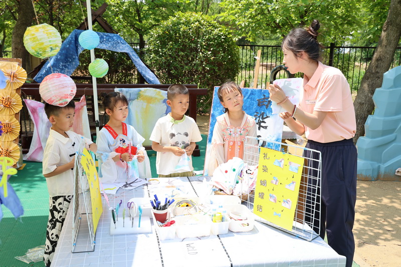 与户外参加非遗文化体验活动的孩子们互动交流