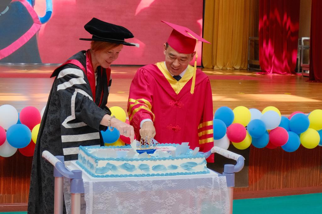 Pascale Quester、曾庆田互赠纪念品,并共同分切“扬帆起航 科启未来”毕业主题蛋糕。
