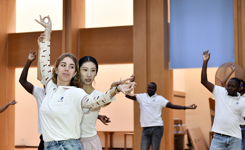 俄罗斯留学生安娜在老师指导下认真学习敦煌飞天舞