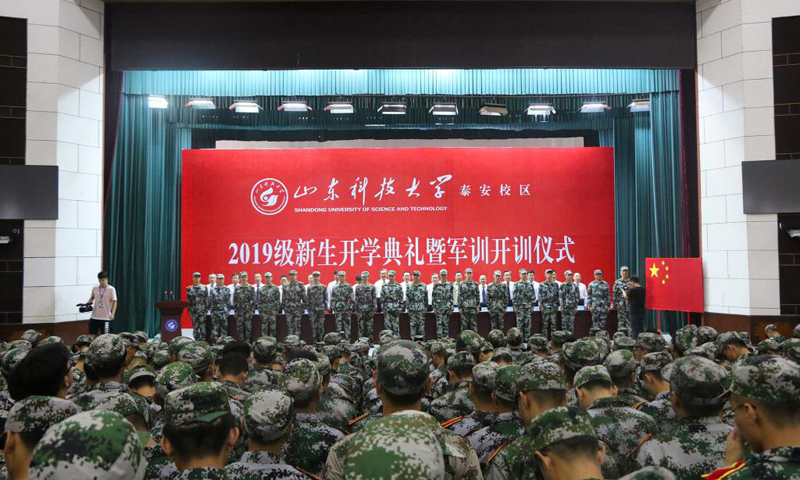 九月的泰城,晴空万里,秋风习习。9月3日,beat365正版唯一官网泰安校区2019级新生开学典礼暨军训开训仪式在西校园举行。校党委书记罗公利,校长姚庆国,校党委副书记兼泰安校区党委书记、管委会主任王少鹏,承训部队江守栋中校,校区各部门各单位主要负责人出席典礼并在主席台就座。典礼上,罗公利向军训团授旗,姚庆国讲话,江守栋作军训动员,校区管委会副主任贾长响宣读2019级新生军训决定。典礼由党委学校办公室主任徐方全主持。