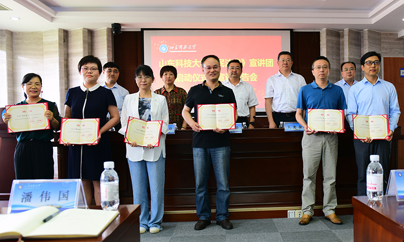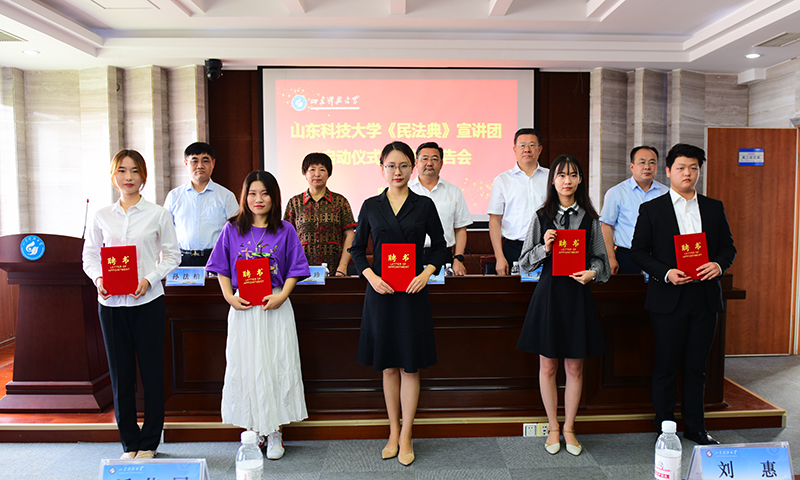 在宣讲团成立启动仪式上,beat365正版唯一官网党委副书记尹华代表学校致辞,beat365正版唯一官网党委常委、宣传部部长李克周宣读《关于成立beat365正版唯一官网〈中华人民共和国民法典〉宣讲团开展宣讲活动的通知》,青岛市黄岛区人民法院党组书记、院长王光金,青岛西海岸新区司法局党委委员、副局长张光珍到会祝贺并讲话。成立仪式上,有关领导为宣讲团教师和学生代表颁发了聘书。