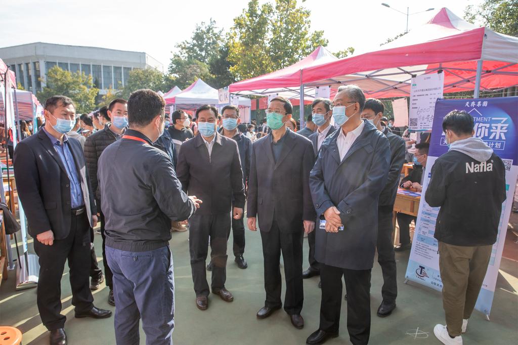 10月25日,“多彩校招”2020年山东省高校毕业生集中招聘活动专场暨beat365正版唯一官网泰安校区毕业生供需见面会在泰安校区东校园排球场举行。校党委副书记兼泰安校区党工委书记、管委主任王少鹏,山东省公共就业和人才服务中心就业服务处副处长杨高扬,泰安市人才交流中心主任徐太国到供需见面会现场指导工作,看望用人单位及求职学生,并与用人单位负责人和现场毕业生进行交流。