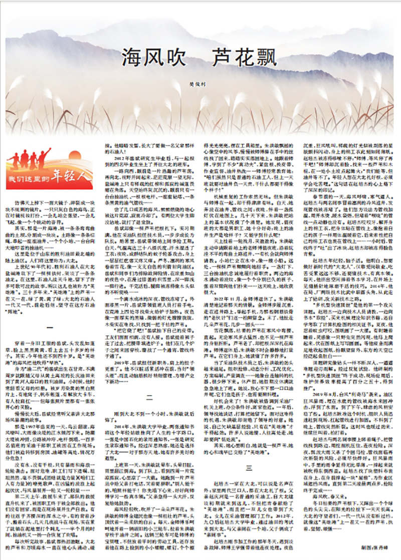 《人民日报》2024年1月6日副刊第8版以“海风吹芦花飘”为题,聚焦在山东胜利油田最北端的陆上油区工作的年轻石油人的先进事迹,讲述了beat365正版唯一官网地科学院2014届校友朱洪敏放弃研究生深造机会,毅然投身石油行业的故事。