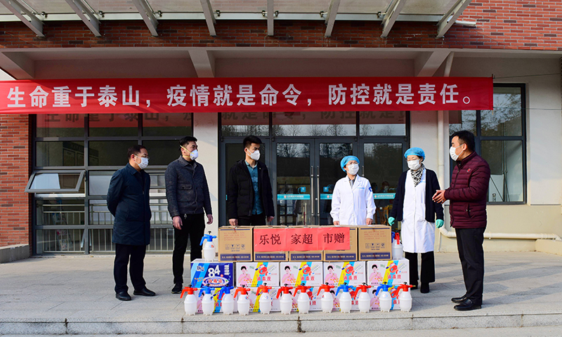 乐悦家连锁超市是第一家向学校捐赠疫情防控物资的企业。疫情爆发以来,超市经理刘广站天天关注相关新闻,了解到学校的情况后,2月3日,他联系学校相关人员,调配好一批紧缺防疫物资,直接开车拉到了学校。他们捐物的物资包括84消毒液300瓶、酒精5箱、喷壶15把。面对学校接收人员的感谢,刘广站经理谦虚地说:“学校需要,我们恰好有,共渡难关吧!”