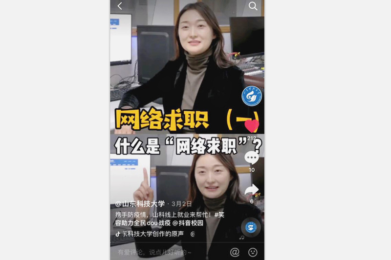 学校宣传部、大学生就业中心充分应用新媒体技术,录制抖音“小视频”,将“网络求职”的小知识以学生们“喜闻乐见”的形式传递给他们,使学生们在娱乐中不知不觉地增强了“求职”意识,获得了“求职”技巧。目前,已在科大抖音平台制作、推出了5期“网络求职”系列节目。