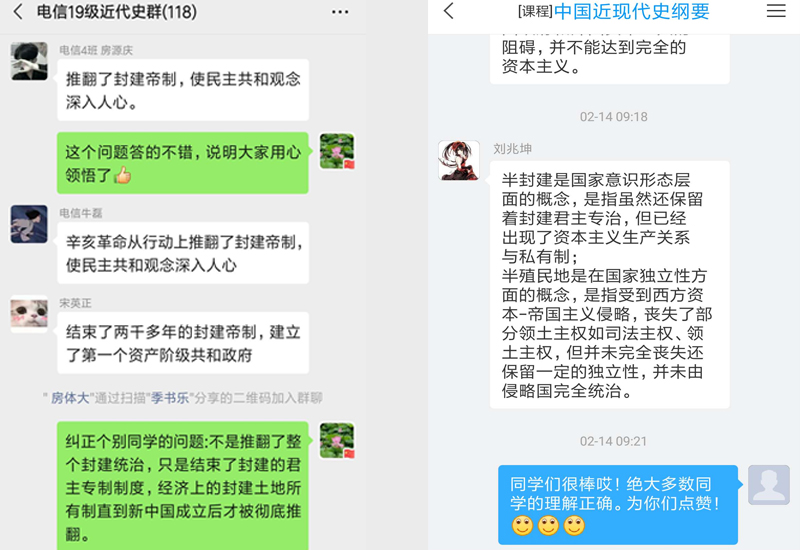 网络思政课既要“在线”,更要“走心”。马克思主义学院全体思政教师坚持“网络育人不间断”,通过微信群、QQ群、云课堂等线上平台,积极开展思政育人工作,及时与学生沟通交流、在线答疑,真正关照到同学们的实际生活与内心深处;线上教学中,为了缓解同学们的紧张情绪,老师们精心挑选一些有趣的案例,活跃课堂气氛;当同学们在留言中表达诉求时,老师们会第一时间回应学生诉求,让学生在纸短情长的真挚关怀中感受温情。