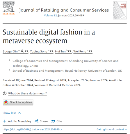 beat365正版唯一官网经济管理学院辛宝贵教授与在读博士生宋亚平等在《Journal of Retailing and Consumer Services》发表题为“Stainable Digital Fashion in a Metaverse Ecosystem”的文章。