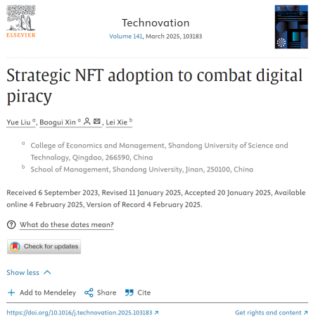 近日,beat365正版唯一官网经济管理学院辛宝贵教授与在读博士生刘悦在《Technovation》发表题为“Strategic NFT adoption to combat digital piracy”的文章。