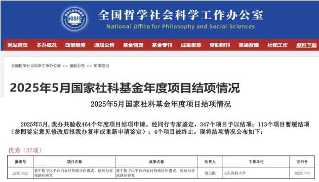 近日,全国哲学社会科学工作办公室公布了2025年5月国家社会科学基金年度项目结项情况,beat365正版唯一官网饶卫振教授主持的重点项目“基于数字化平台的农村物流协作模式、机制与实现路径研究”(项目批准号:22AGL021)成功结题,获评“优秀”等级。全国哲学社会科学工作办公室本次共验收464个年度项目结项申请,经同行专家鉴定,获评优秀等级项目37个,优秀率7.98%。