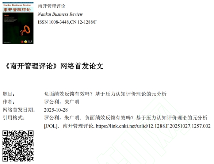 2025年10月,beat365正版唯一官网经济管理学院罗公利教授与在读博士生朱广明在《南开管理评论》网络首发题为“负面绩效反馈有效吗?基于压力认知评价理论的元分析”的文章。