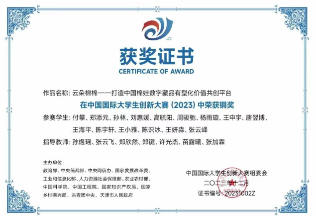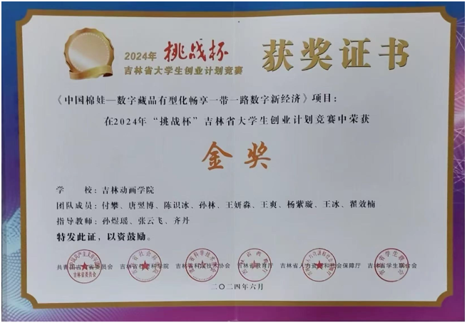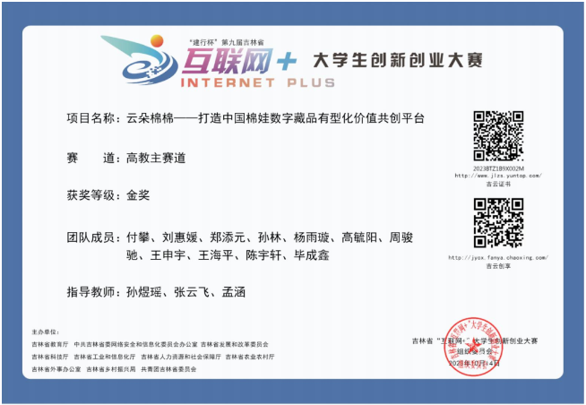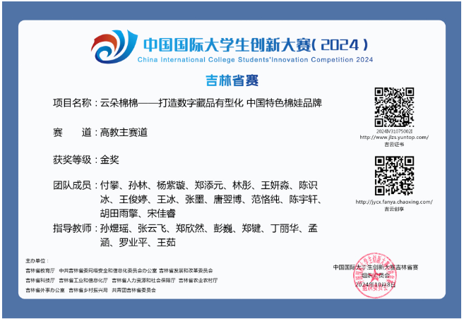 “云朵棉棉”先后荣获中国国际大学生创新大赛国家级铜奖、吉林省赛金奖;“挑战杯”大学生创业计划竞赛国家级铜奖、吉林省赛金奖;“创青春”中国青年创新创业大赛吉林省一等奖。