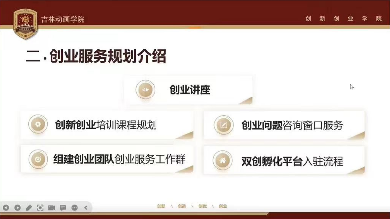 会议主要围绕创业服务规划的解读及创业相关资源发布方面展开。创业孵化办公室全体创业导师和动画艺术学院、动画产业学院、漫画学院、游戏学院、虚拟现实学院、电影学院、文商学院的学生团队、师生共创团队共计近40个初创团队参加本次线上交流会。