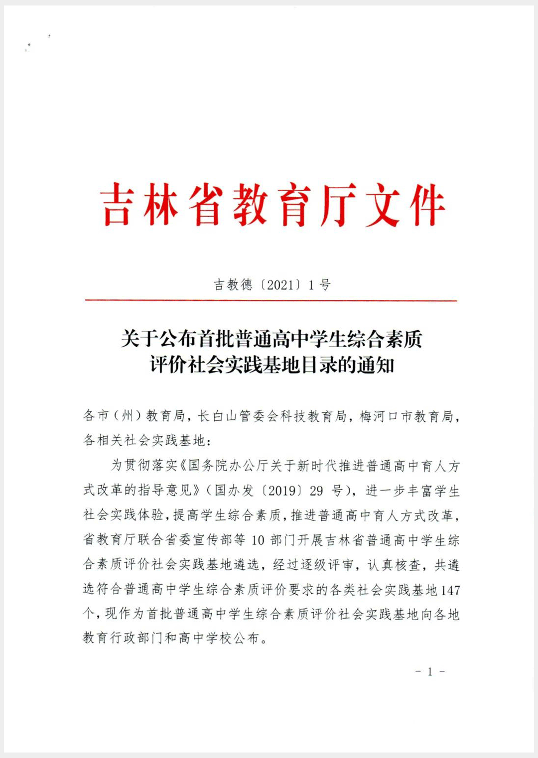 近日,金沙官网在全省近千家参评单位中脱颖而出,被吉林省教育厅批准为“吉林省首批普通高中学生综合素质评价社会实践基地”。