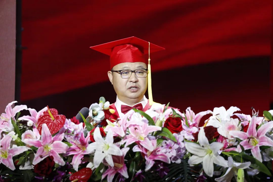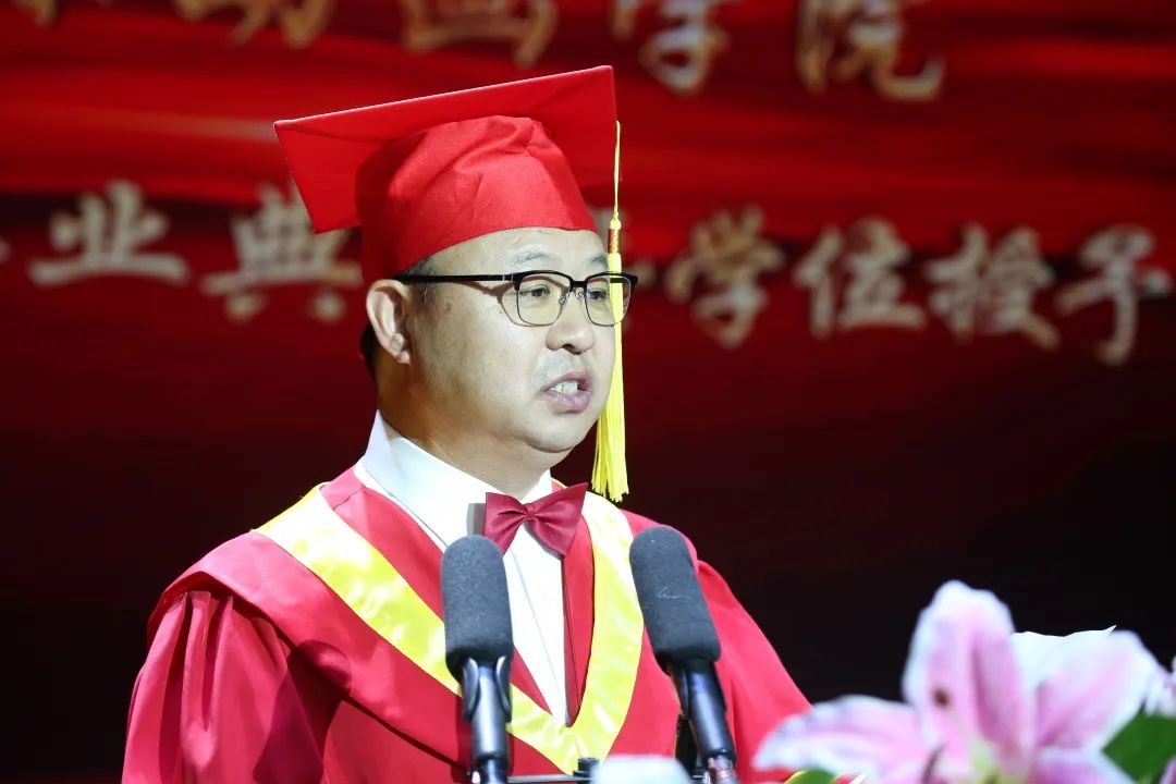 同学们,在过去的四年里,你们把洋溢着浪漫与热情的“青春足迹”,留在了操场、校园和每一个尽情施展才华的舞台;你们把彰显着求索与创新的“奋进姿态”,留在了课堂、工作室和每一次论坛峰会互动的现场。你们从入学之初“对专业新奇、对未来懵懂”,到今天“精通专业、洞悉行业、锚定职业”,对未来有着清醒认知、清晰定位、清楚规划。你们陪母校一同经历了“十八岁的成人礼”,母校伴你们共同成长、共度最宝贵的“青春韶华”。母校见证了你们“日积跬步、以致千里”的进步,助力你们实现了“百炼成钢、破茧成蝶”的蜕变;你们陪伴母校不断深化“开放式国际化、学研产一体化、创意产品高科技化”三大办学特色、强化“创新、创造、创优、创业”四创核心文化、坚定“为学生负责、为家长负责、为行业负责、为社会负责、为国家负责”五负责办学理念,持续推进特色高水平应用型大学建设,实现“健康发展、特色发展、快速发展、内涵发展”,朝着未来“文化产业大学”和“百年名校”目标大踏步前行。
