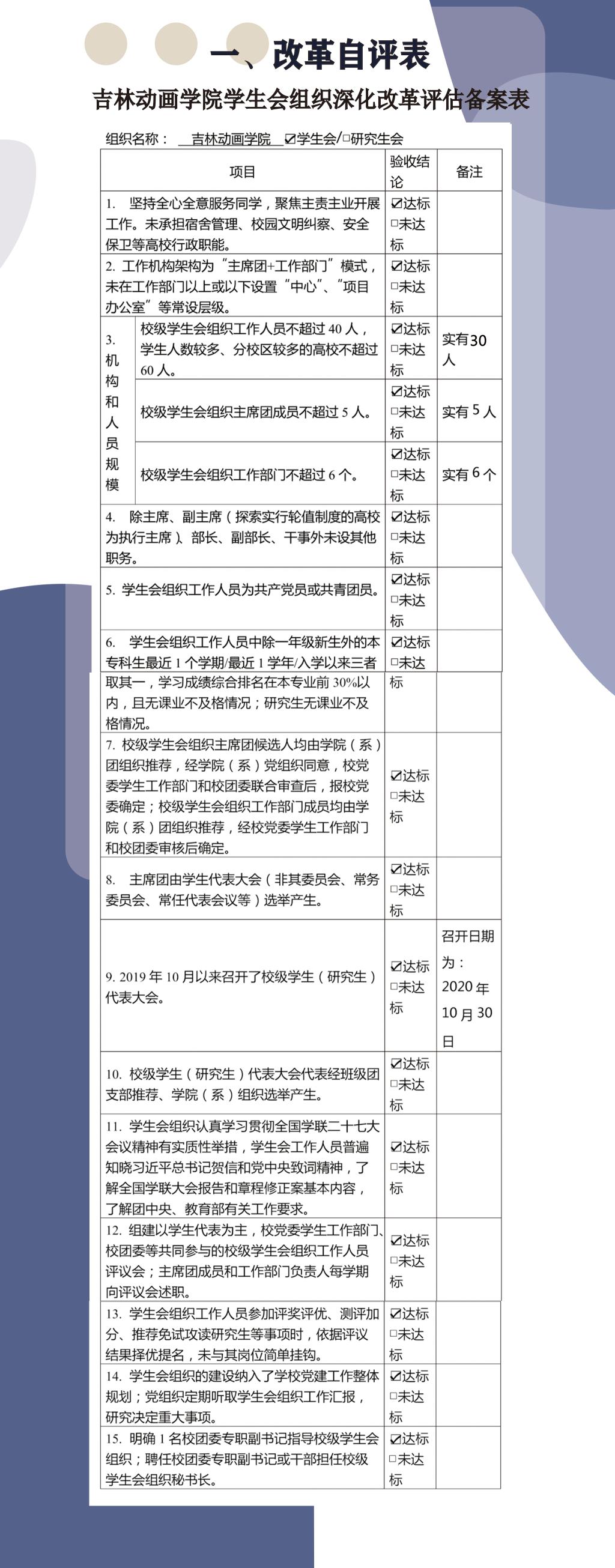 9001jcc金沙以诚为本学生会组织改革情况 发布时间:2020年11月17日 16:43:10 浏览:次 | 改革自评表 | |9001jcc金沙以诚为本学生会章程| | 校级组织工作机构组织架构图 | | 校级组织工作人员名单 | | 校级组织主席团成员候选人产生办法及选举办法 | | 校级学生代表大会召开情况 | | 校级学生代表大会产生办法 | | 校级组织工作人员述职评议办法 | | 学校党委指导学生会组织工作情况 | | 校团委指导学生会主要责任人 |