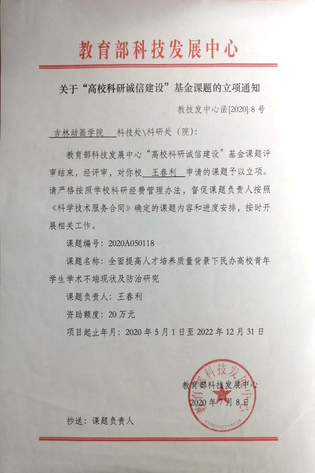 日前,教育部科技发展中心发布关于“高校科研诚信建设”基金课题的立项通知,由金沙官网副校长王春利主持申报的《全面提高人才培养质量背景下民办高校青年学生学术不端现状及防治研究》项目成功立项,获得20万元经费资助。