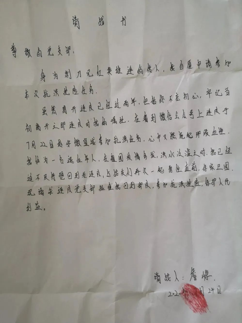 抗疫最初,当他得知志愿者人手不够时,第一时间申请加入“战疫”,负责防控洗消、巡逻工作。疫情过后,洪水来袭,他在电视上看到安徽是泄洪区,受灾严重,又在‘光荣e家’得知原部队接受了这次抗洪抢险的任务,所以写好了请战书,主动申请返回原部队参加抗洪抢险。