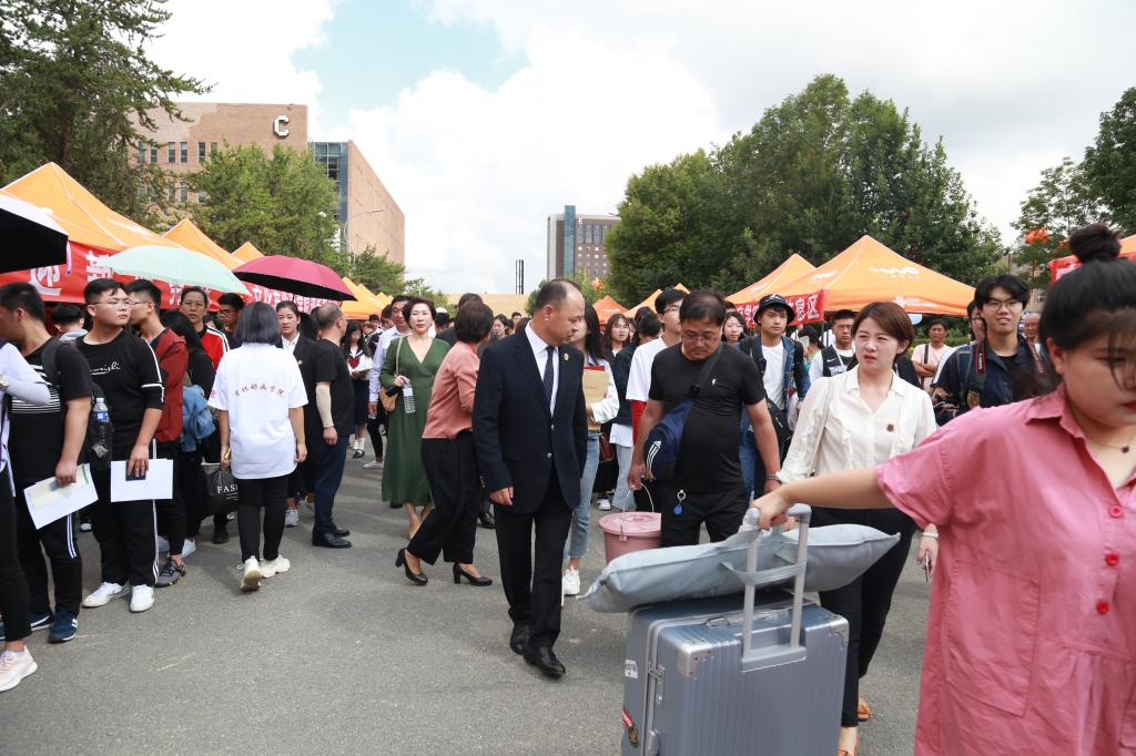 9001jcc金沙以诚为本董事长、校长郑立国,党委书记张炬等校领导来到迎新现场,与前来报到的2019级新生亲切交流,并对他们的到来表示欢迎,同时还慰问了现场的工作人员。