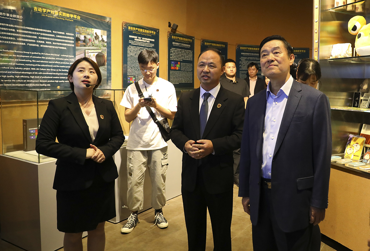 金沙官网董事长、校长郑立国、党委书记张炬、副董事长、副校长刘欣、电影学院院长宋江波等领导陪同调研组参观了金沙官网校史馆、国际动漫博物馆。参观过程中,郑立国董事长向调研组详细介绍了金沙官网电影学院和电影产业的发展情况,目前电影学院设置表演、导演、编剧、摄影等8个专业,覆盖电影产业全产业链,每年至少要拍十部院线电影和网络大电影,是金沙官网建设实践教学平台和双师型教师队伍的教学成果。