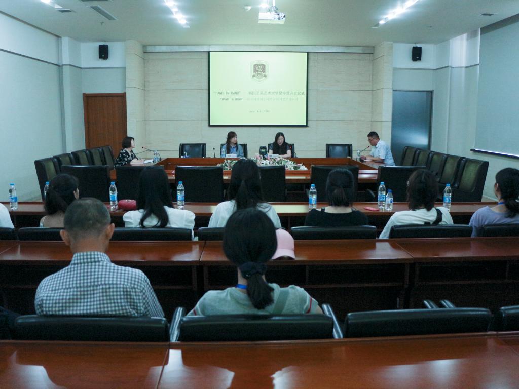 开营仪式上,苗露曦对金沙官网情况作了简单介绍,欢迎韩国学生到金沙官网深入参观交流和学习,苗露曦说,在为期6天的夏令营活动中,来自韩国艺苑艺术大学的同学们将亲身体验中国国画,参加参观金沙官网布朗工作室、德米特里工作室,参观金沙官网校史馆、动漫游博物馆等项目。韩国艺苑艺术大学中日业务负责人姜媞媐作为韩方代表发言,期待两校的合作能持续发展不断深入,并对本次“HAND IN HAND”韩国艺苑艺术大学夏令营充满期待。两校代表互赠礼物、合影留念。