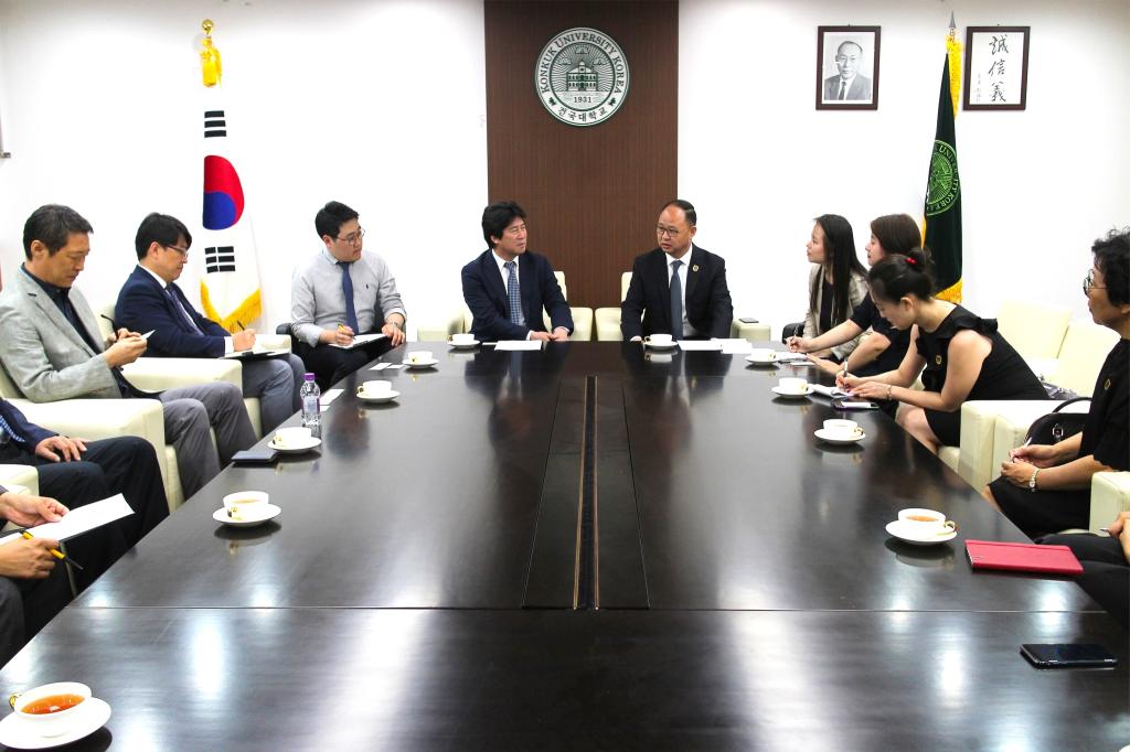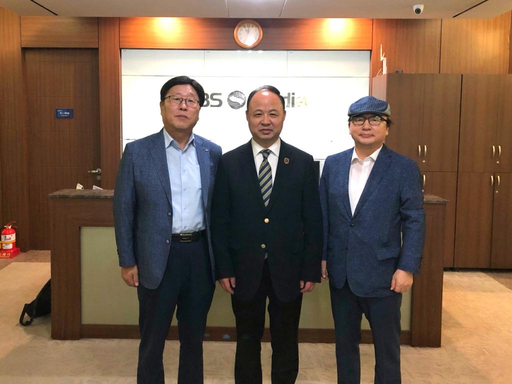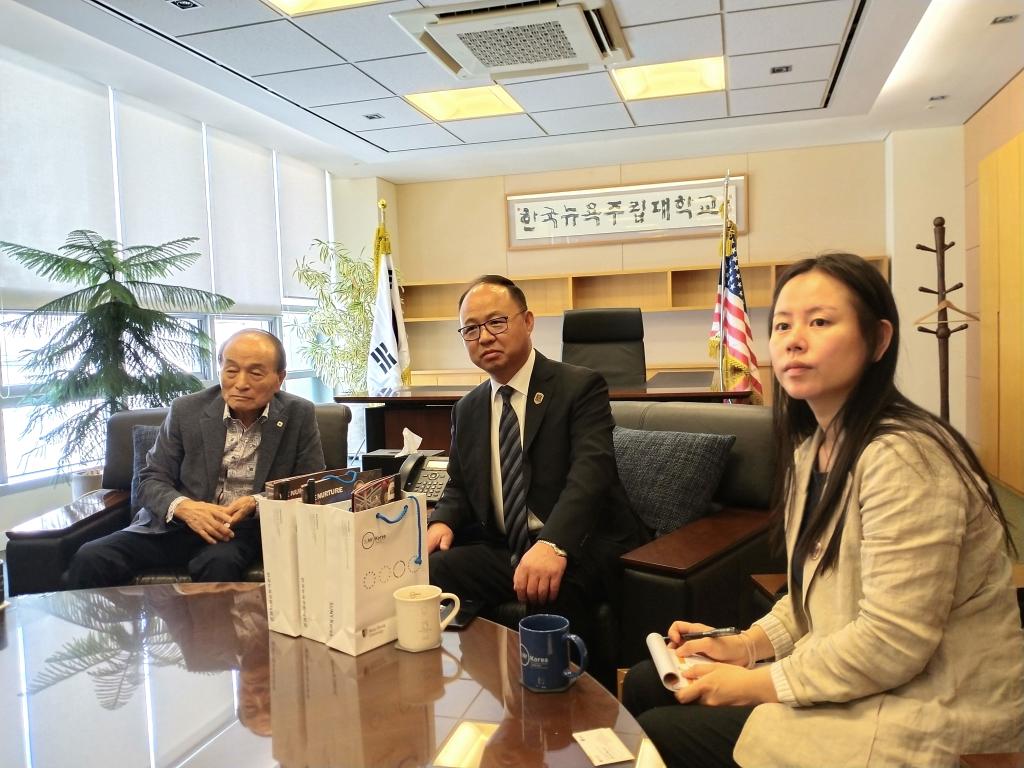 ▲9001jcc金沙以诚为本董事长、校长郑立国、韩国KBS媒体代表禹钟宅、具钟祥亲切会面