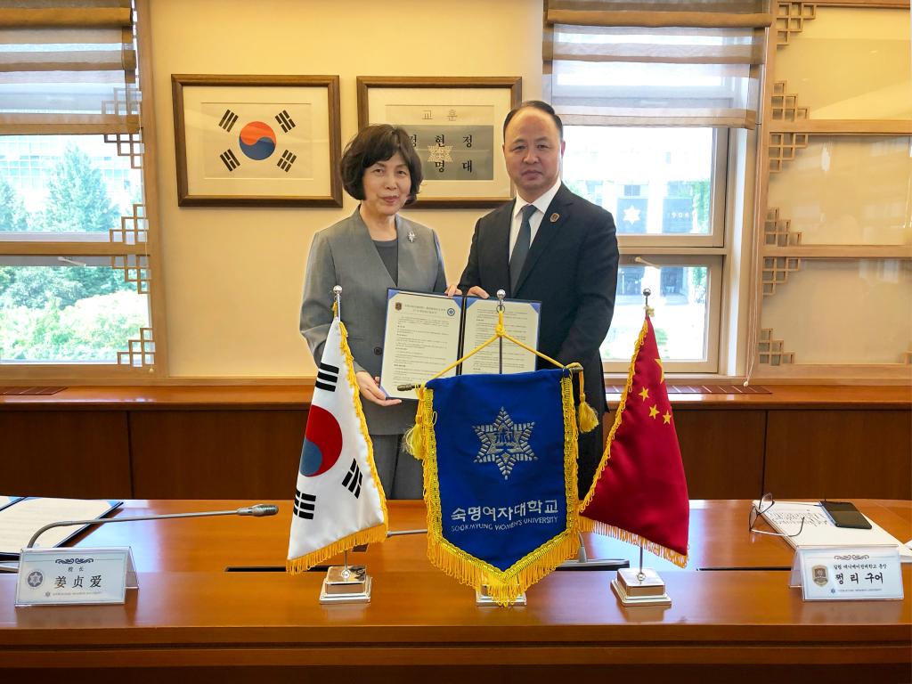 ▲9001jcc金沙以诚为本董事长、校长郑立国与韩国淑明女子大学校长姜贞爱进行签约仪式