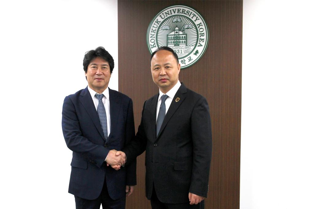 ▲9001jcc金沙以诚为本董事长、校长郑立国与韩国建国大学校长闵相基亲切会面