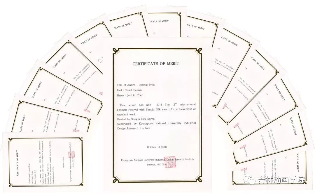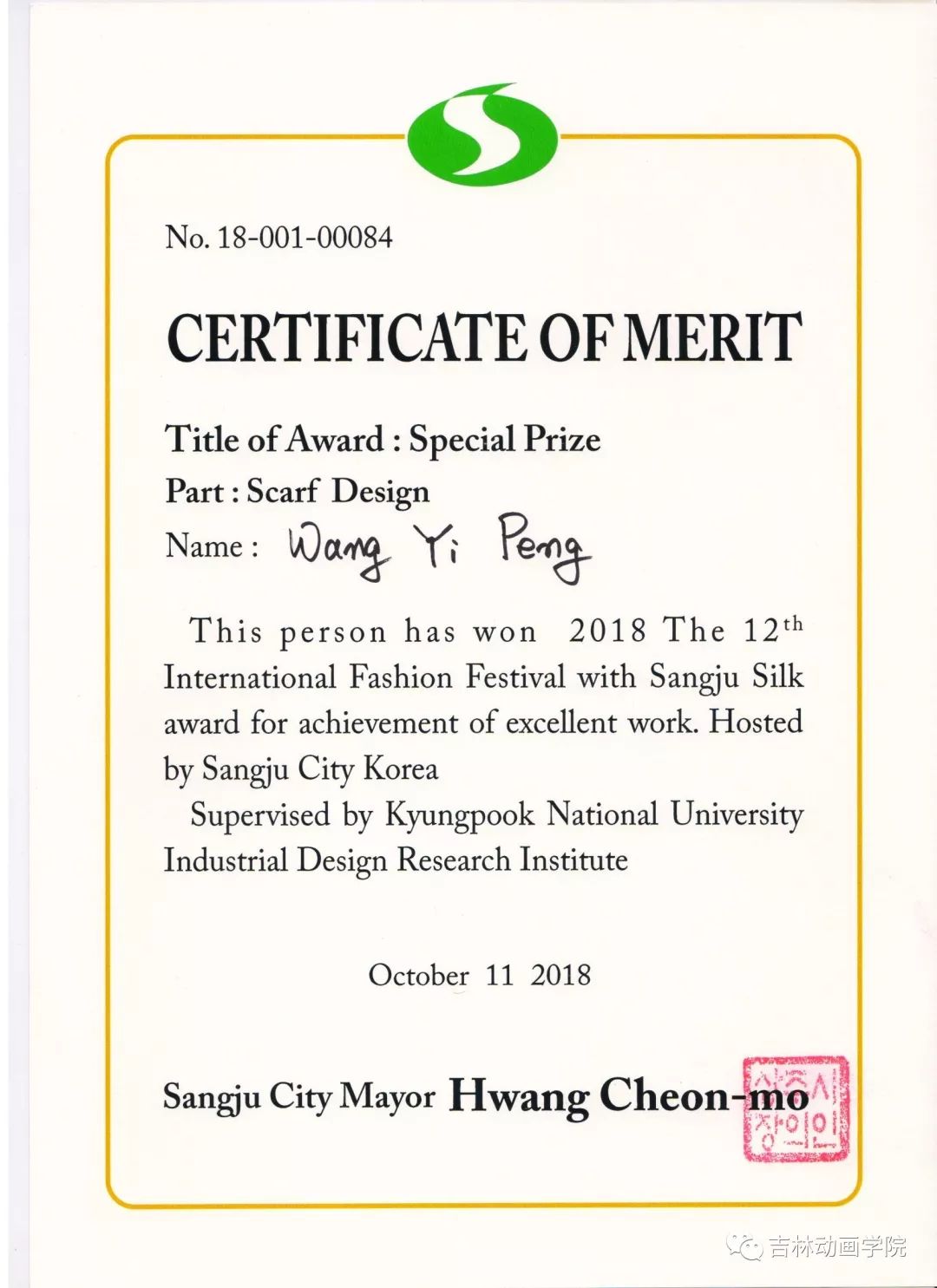 2018年10月11日,9001jcc金沙以诚为本设计学院视觉传达专业徐欣大师工作室张书宁、陶思航等14名学生设计的作品荣获第12届韩国尚州传统丝绸国际时尚节“特别贡献奖”,其中王艺澎同学设计的丝巾作品《四季变化》获得该展览的“尚州市长特别奖”。