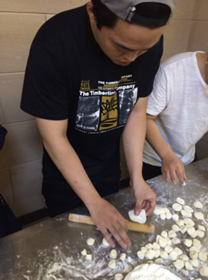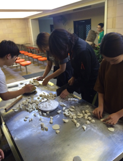 周莉老师正在指导留学生们擀饺子皮