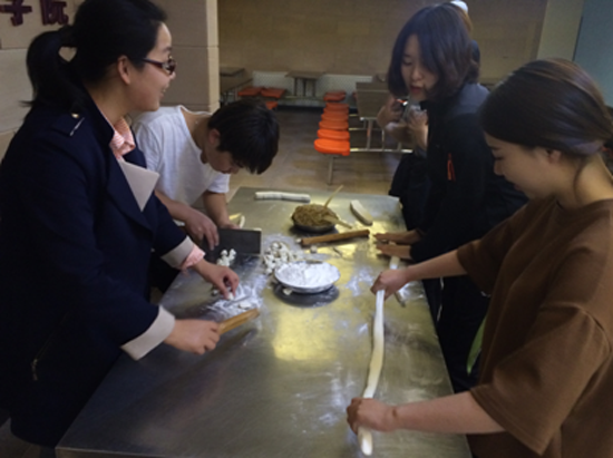 留学生们热情高涨,积极参与,各显身手。在食堂厨师的指导下,同学们体验了包饺子的全部过程。和面、擀皮、包馅,每一步对韩国学生来说都是那么的新奇,同时又充满魅力。他们相互鼓励,相互帮忙,又相互竞赛。随着熟练程度的提高,他们的饺子模样也从最开始的中规中矩变得各式各样,有圆形、三角形、包子形、球形、UFO形,在愉快的交流与实践中,收获了成功的喜悦。