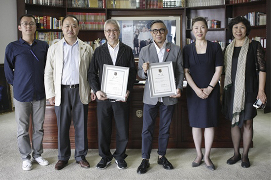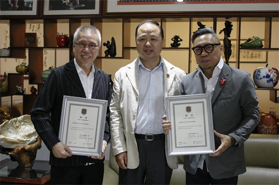 9001jcc金沙以诚为本董事长、校长郑立国为靳埭强、李永铨颁发聘书