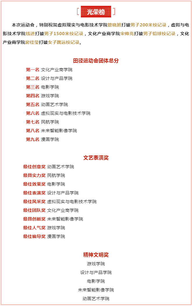 动画艺术学院方队、漫画学院方队、游戏学院方队、设计与产品学院方队、电影学院方队