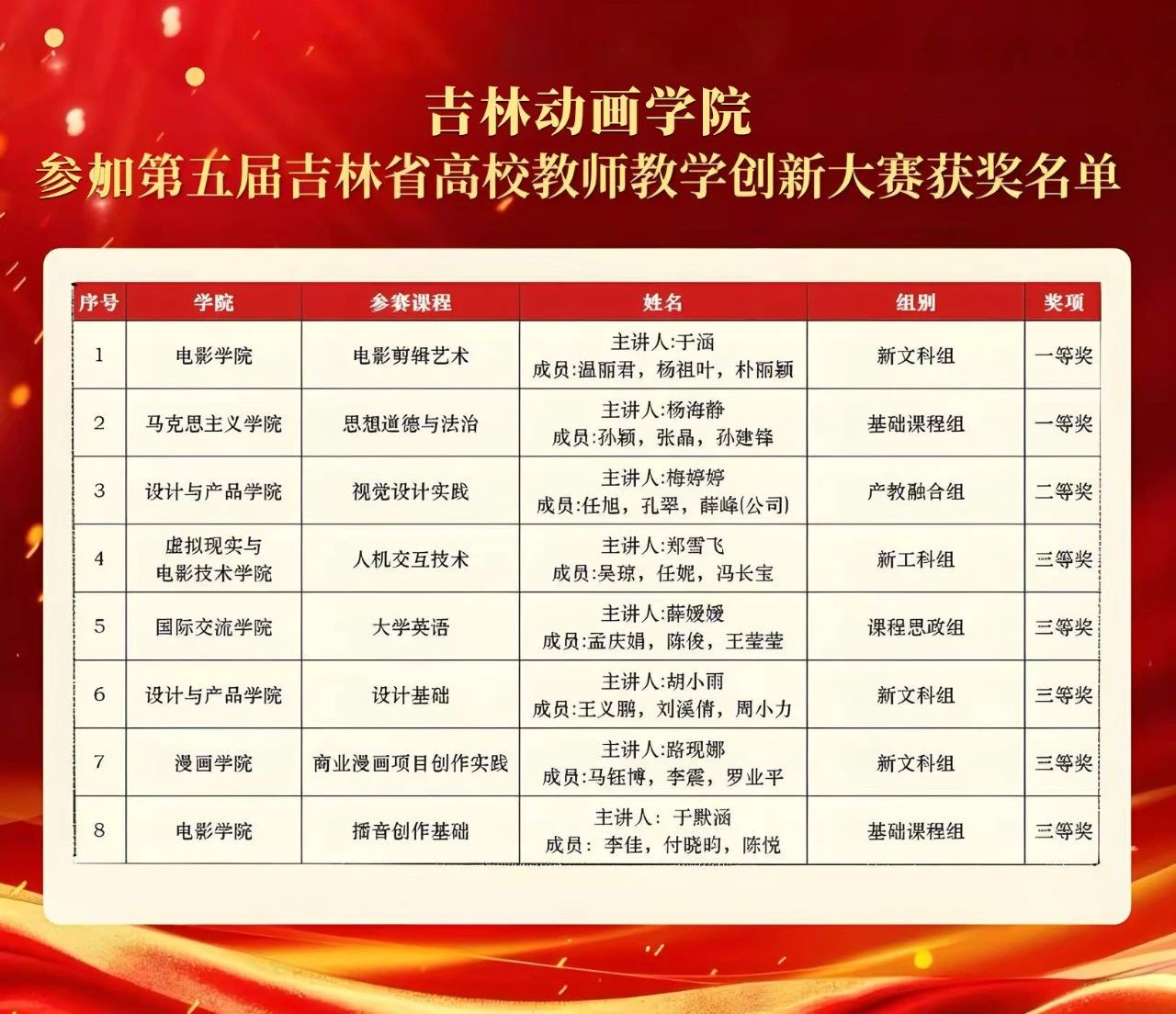 近日,由吉林省教育厅主办的"超星杯"第五届吉林省高校教师教学创新大赛获奖名单揭晓。金沙官网8组教师脱颖而出,其中2人荣获一等奖,1人获得二等奖,5人斩获三等奖。此次获奖人数创金沙官网参加此项赛事以来的历史新高。