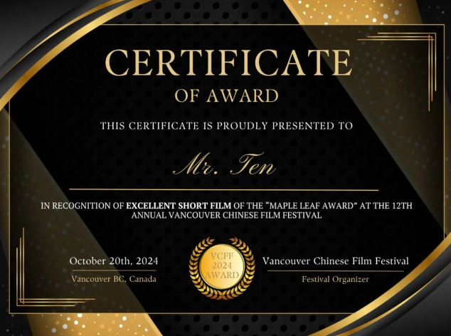 “温哥华华语电影节”是经加拿大不列颠哥伦比亚省政府注册的非营利性海外华语电影节,以“推广华语电影、传播中国文化”为使命,汇聚了众多优秀的作品和杰出的创作者,成为了全球电影爱好者关注的焦点。自2013年起已成功举办了十二届。参赛作品涵盖了各种题材和风格,从深刻的社会现实到奇幻的想象世界,从细腻的情感刻画到紧张刺激的剧情发展,每一部影片都堪称佳作!本次电影节吸引了来自全球各大高校的优秀作品参评,经过层层严格评选,《老十》斩获“优秀短片奖”。