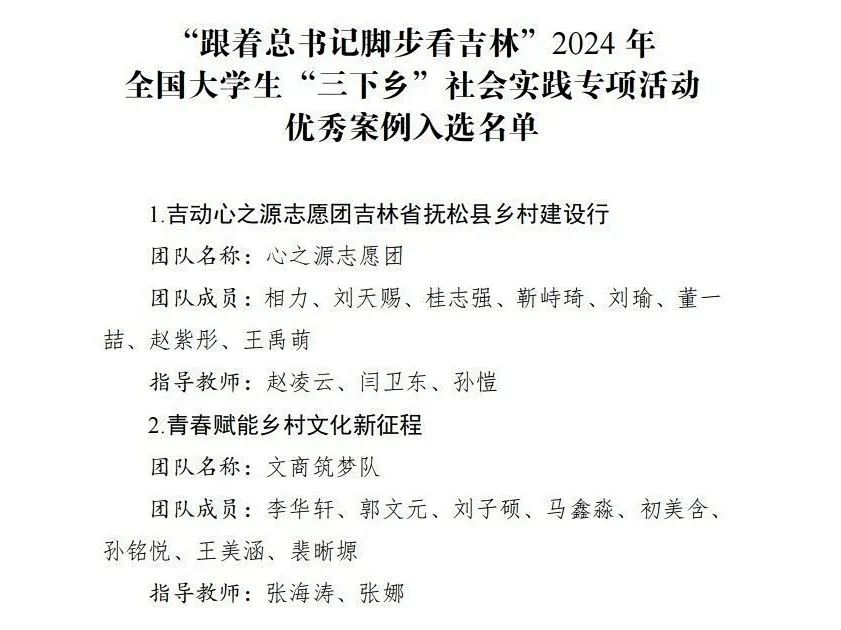 学校将以此次入选省级优秀案例为契机,进一步总结经验,不断完善社会实践育人体系,持续组织引导广大学生积极投身社会实践,在服务社会中展现青春风采,为奋力推动吉林高质量发展明显进位、全面振兴取得新突破贡献更多的青春力量。同时,希望更多的吉动学子以这两支团队为榜样,积极参与社会实践,在实践中书写属于自己的青春华章。
